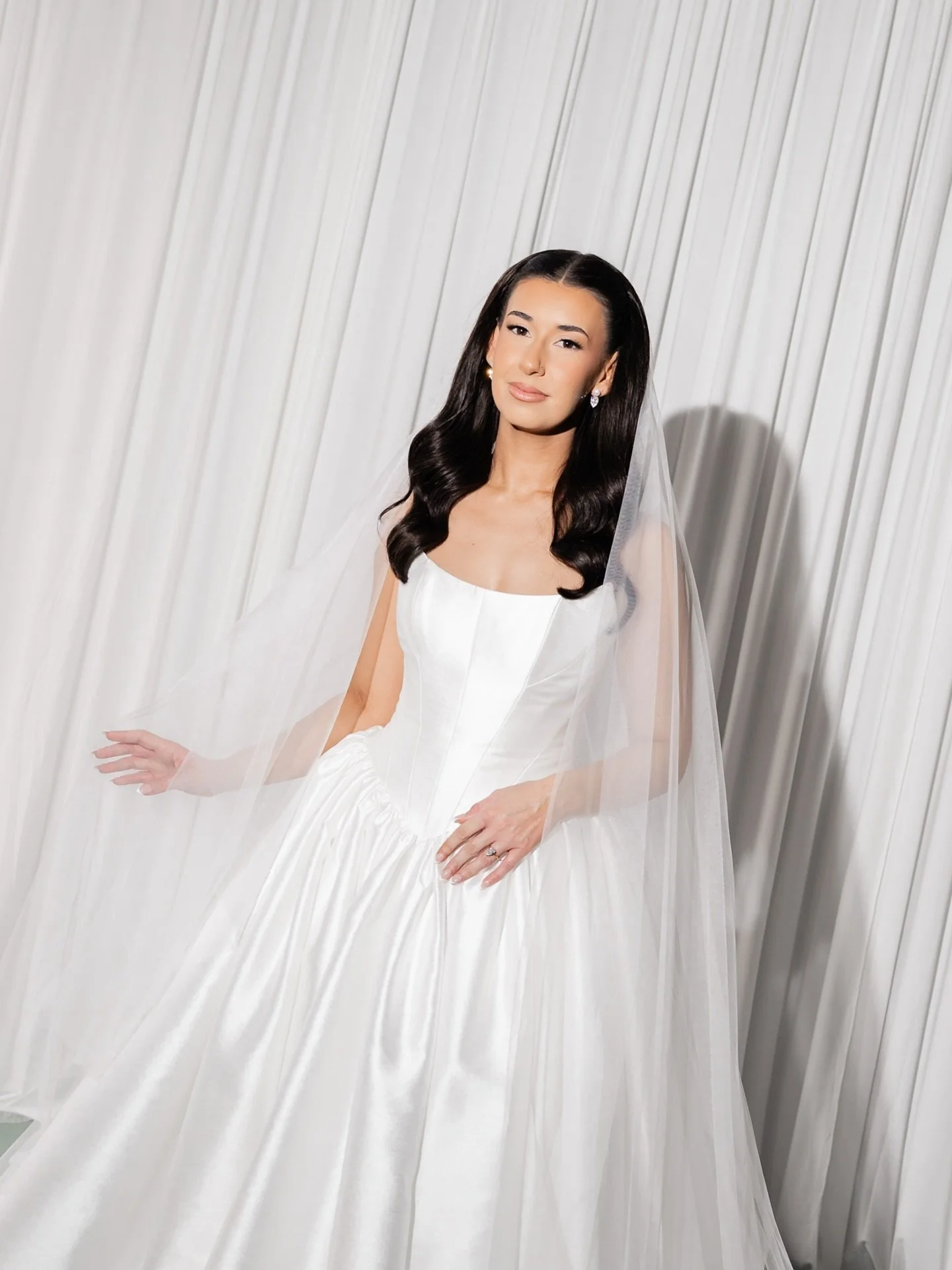 Handcrafted from soft tulle and finished with fine lace edging, it’s a style that brings quiet drama and old-world romance to your bridal look.